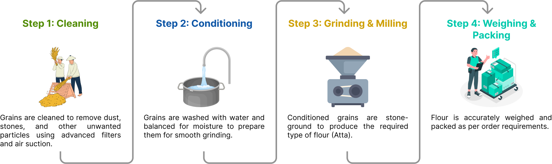 Pavitraa Atta is made from premium Sharbati and Sihori wheat, sourced directly from trusted farmers. Using state-of-the-art milling technology and 100% chakki fresh methods, it is processed chemical-free to retain natural fiber, ensuring unmatched taste, softness, and nutrition for wholesome, nourishing meals.
