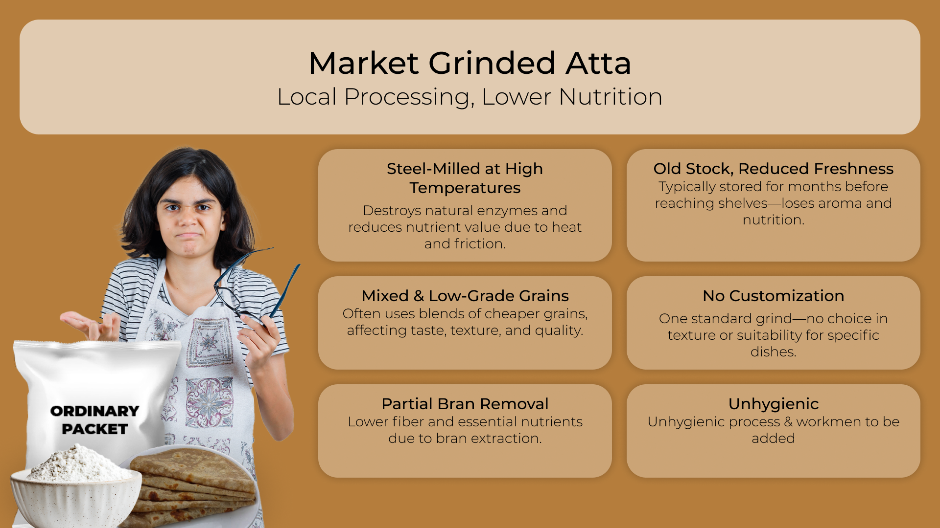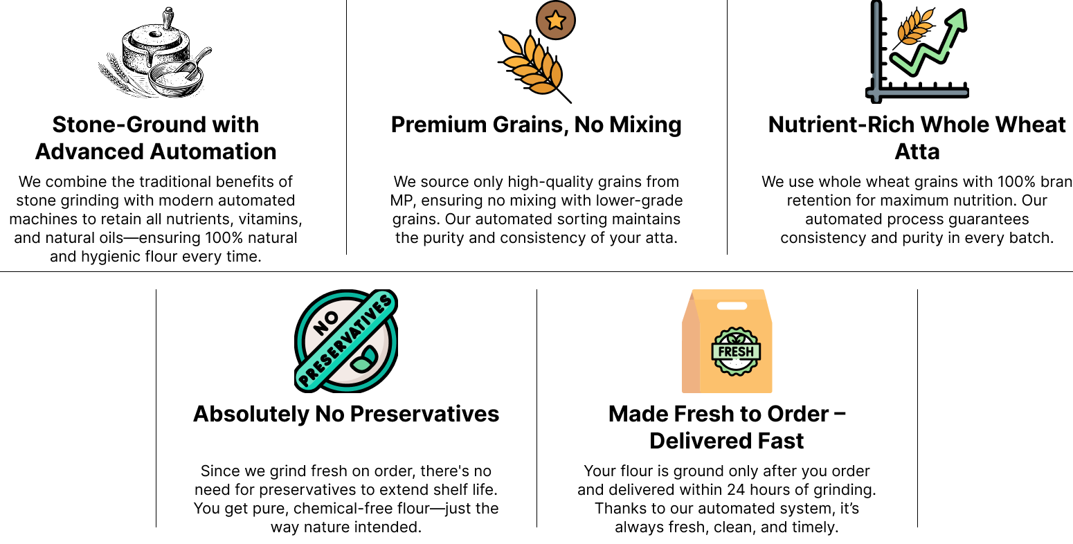 Premium M.P Sharbati & Sihori Chakki fresh Atta wheat flour, freshly ground in-house using state-of-the-art technology, ensuring unmatched taste, softness, and nutrition for your meals